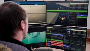 En un laboratorio en la orilla, trabajadores de la empresa Impossible Metals monitorean el gran robot amarillo a través de pantallas y con un control parecido al de videojuegos dirigen sus movimientos.