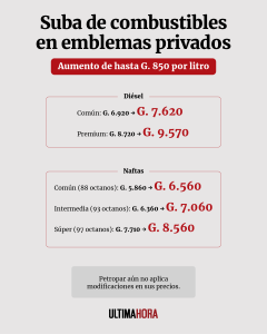 De esta manera, varios emblemas privados aplicaron subas de hasta G. 850 por litro; mientras que Petropar mantiene sus valores, pero dentro de un contexto internacional que presiona a eventuales nuevos ajustes.