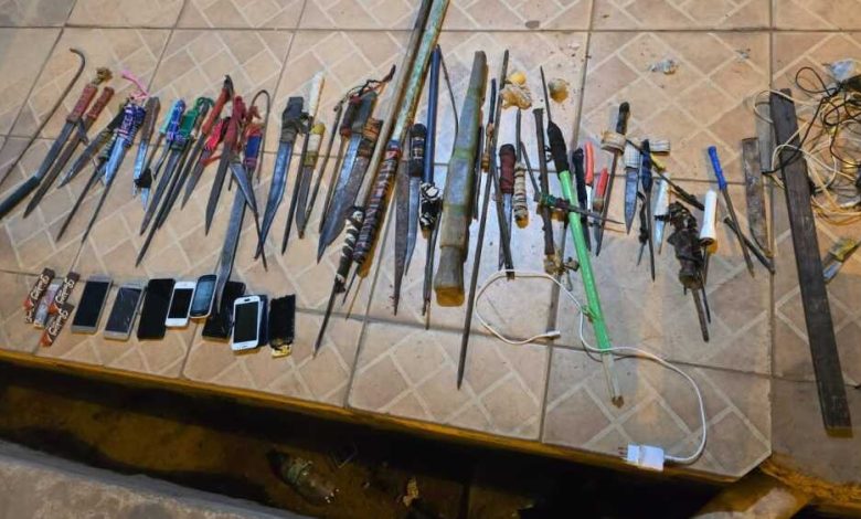 Además, se encontraron varios envoltorios conteniendo presuntos estupefacientes, armas corto-punzantes de fabricación casera, siete teléfonos celulares de distintas marcas y modelos, cargadores para los mismos, y varias botellas y recipientes con bebidas alcohólicas de elaboración artesanal.