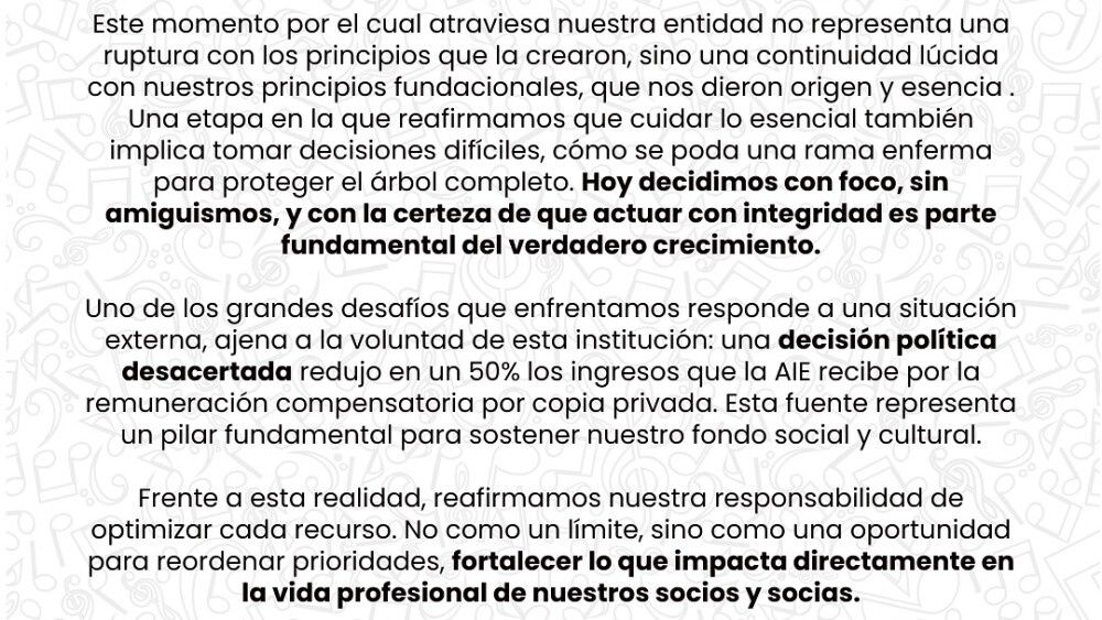 Barrios relató que él y sus compañeros manifestaron su preocupación ante estos hechos. “Entramos todos juntos, frente al asesor jurídico, nos explicaron que cierra la escuela por motivos oficiales, ‘se redujo la entrada de copia privada a la entidad en un 50%, que es un canon que se paga al importar productos electrónicos que puedan contener música’”.