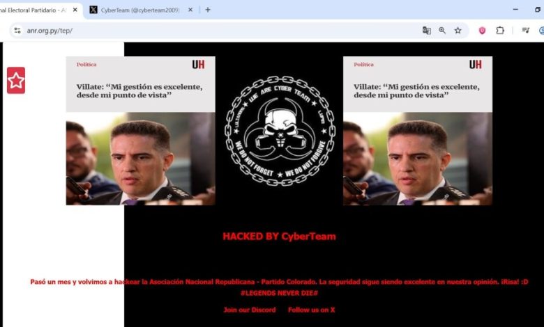 El grupo Cyber Team, que ya había hackeado la gran mayoría de los sitios webs de instituciones públicas, vulnerando miles de datos ciudadanos, ahora hackeó la página del Tribunal Electoral Partidario (TEP) de la Asociación Nacional Republicana (ANR), Partido Colorado.