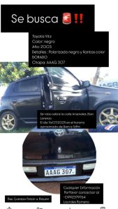 Lourdes Pamela Romero Aveiro, de 31 años, manifestó a Última Hora que su automóvil Toyota Vitz RS 2000, de color negro, lo dejó estacionado frente a su lugar de trabajo el último miércoles y cuando finalizó su jornada, en el momento que disponía retirarse, se percató de que se lo habían llevado.