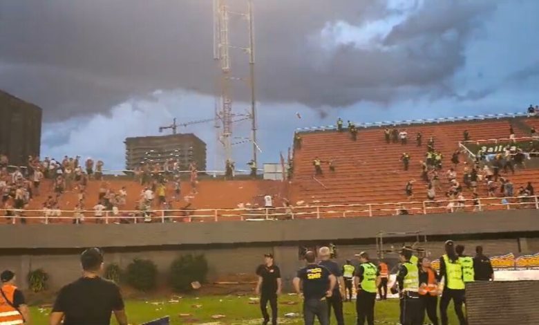 Se pudo divisar a hinchas del elenco franjeado que pasaron desde Graderías Sur hacia Plateas para arrojar butacas a los hinchas cerristas que aún quedaban en el recinto deportivo.