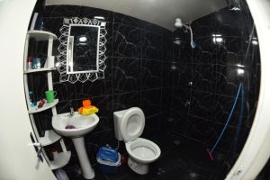 Una de las habitaciones, bien iluminada y pintada de blanco inmaculado, estaba adornada con cuadros y espejos, tenía pisos relucientes y una cortina que otorgaba mayor privacidad a una cama somier. Además, contaba con un baño privado, revestido con azulejos y equipado con todas las comodidades.