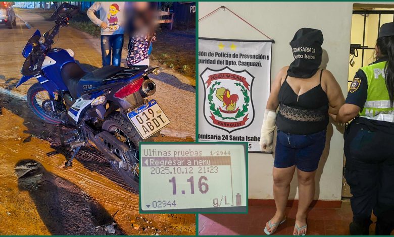 Motociclista ebria quedó detenida tras chocar contra un automóvil en Caaguazú.