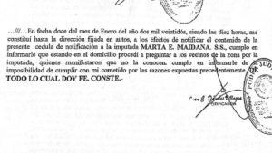 Marta Elizabeth Maidana de Martínez jamás fue notificada ni llamada a declarar. Sin embargo, según el ujier Juan Dávalos Villagra, el 12 de enero de 2022 se presentó en un domicilio en Villarrica –donde supuestamente vivía Marta– y aseguró haber sido atendido por ella. El acta indica que le leyó la imputación, le entregó una copia y le pidió firmar. La mujer se negó. Todo apunta a que alguien se hizo pasar por Marta y usurpó su identidad.