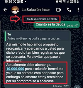 Finalmente y para sorpresa de la docente, en diciembre del 2025 le dijeron que ella no había pagado “nunca” y le reportaron en Informconf como persona morosa y le pidieron G. 10.000.000 “para exclusión inmediata”, advirtiéndole que su carpeta “está por pasar para embargo”.
