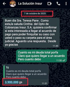 Mientras, cobradores de Insur SA, constantemente se comunicaban con Pane, a quien primero le indicaron que tenía una deuda de G. 4.625.000, luego en octubre cambiaron el monto, que el saldo pendiente era G. 3.900.000.