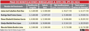 • 4.488 millones de guaraníes sería el monto total en tres tipos de bonificaciones que pagó el IPS a jefes y directores.