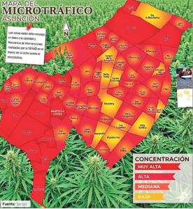 El mapeo de zonas rojas del microtráfico también resalta que cuarenta barrios asuncenos son catalogados de “alta”, mientras que once barrios tienen la calificación de “mediana”; por tanto, no existe un solo barrio exento.
